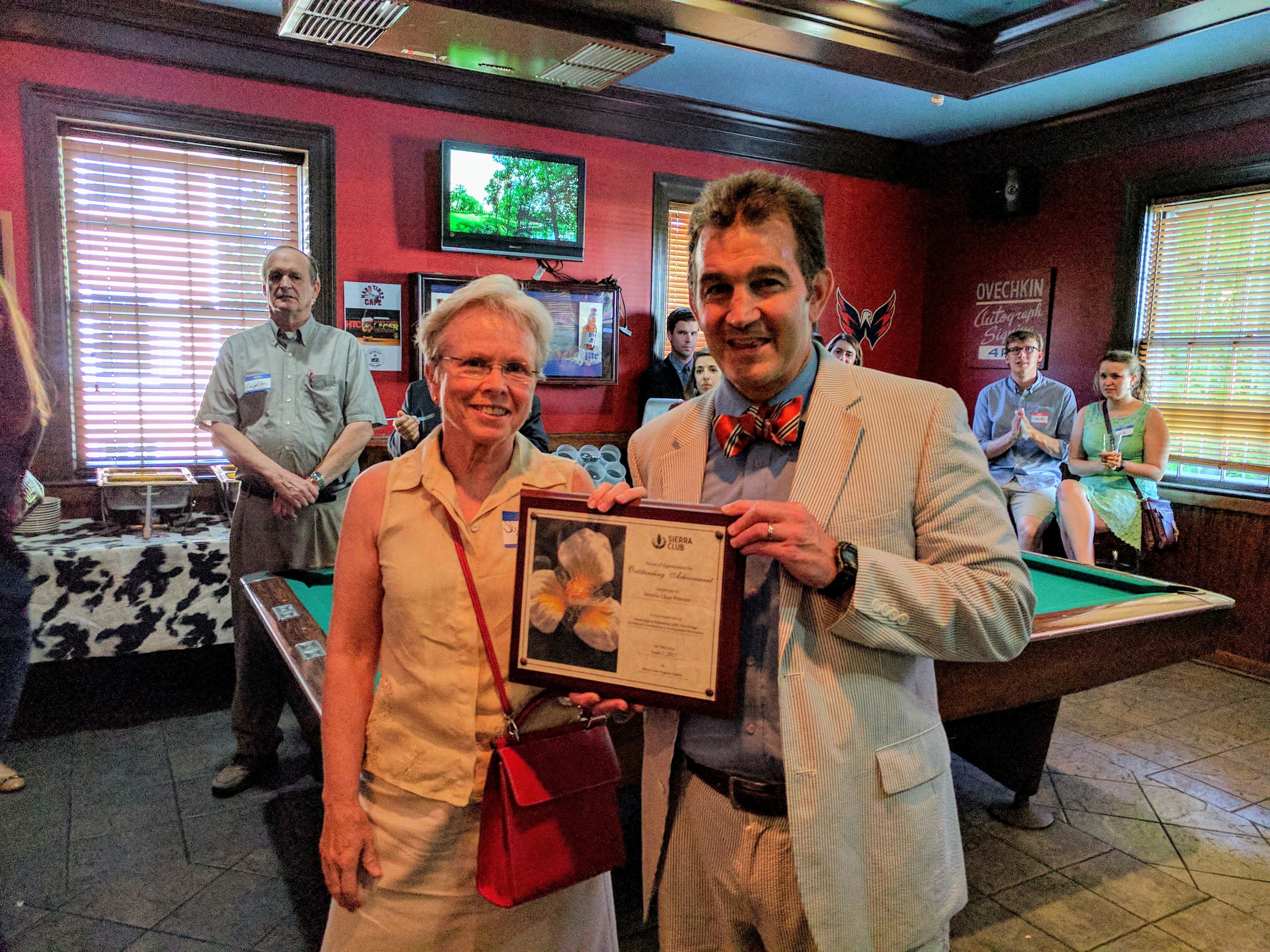 Sierra Club Legislative Chair Susan Stillman presents the Good Government award to Senator Chap Petersen. Photo credit Sierra Club.