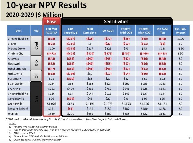 The analysis Dominion ultimately produced, showing 10-year Net Present Values for certain of its generating units, under various scenarios. Notice biomass doesn’t do too well either. The analysis omits some additional units, apparently because they are already scheduled for retirement.