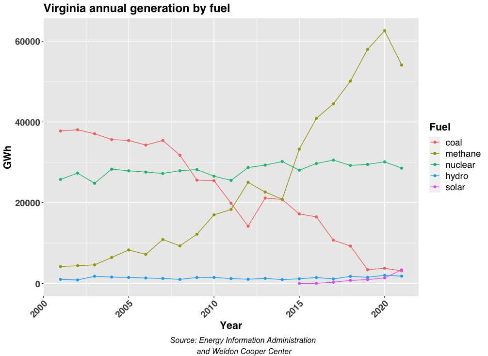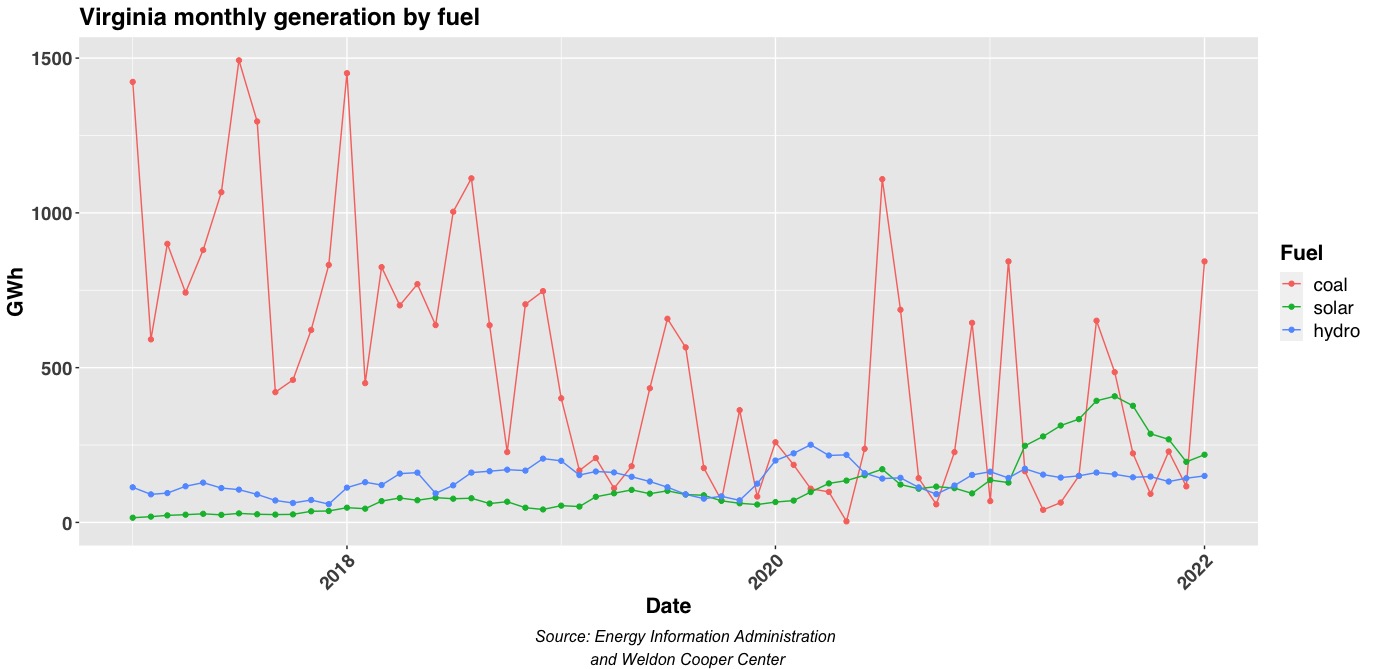 Using Energy Information Agency data, the Weldon Cooper Center at the University of Virginia produced these two graphs. Bill Shobe, the center’s director of economic research, says Virginia generated 3,365 gigawatt-hours (GWh) of electricity with solar and 3,130 GWh with coal.